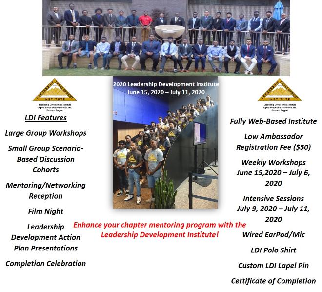 | The Eastern Region is happy to continue the Alpha Phi Alpha Fraternity, Inc. mandate to serve youth and particularly young men by holding its annual Leadership Development Institute (LDI). Due to the Covid 19 pandemic, LDI will occur as a web-based program. The LDI leadership team and staff have developed an Institute that contains most of the elements resident in our traditional Institutes. All chapters are encouraged to sponsor Ambassadors. The 2020 Institute is robust, comprehensive, and effective. This is a great opportunity for chapter's to enhance their mentoring programs with a great summer development experience. The registration fee is low and the benefits are high! We are looking forward to a great LDI! |